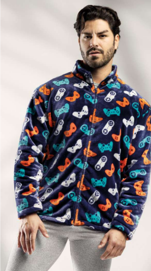 Batín de coralina ultra suave y cálida, ideal para abrigarse en casa. Diseño en azul marino con divertido estampado gamer de mandos y consolas en tonos turquesa, naranja y blanco. Cuenta con cuello clásico, cierre con botones y bolsillos frontales para mayor practicidad.