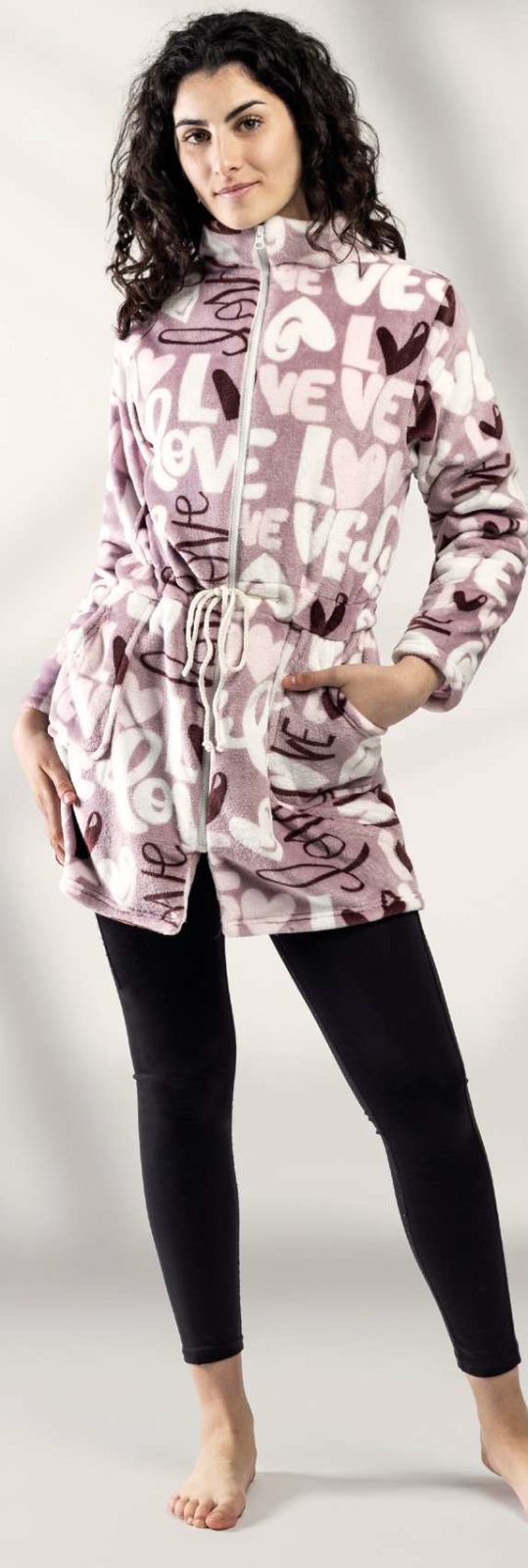 El batín Lin en color malva está confeccionado en 100% poliéster, con un diseño moderno de estampado “Love” y cinturón ajustable que realza la silueta. Su textura cálida y suave lo convierte en la prenda ideal para disfrutar de comodidad y estilo en casa durante el otoño e invierno.