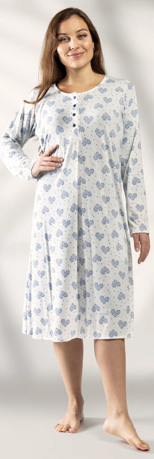 El camisón Lin 6569-C en manga corta luce un delicado estampado de corazones azules sobre fondo blanco. Confeccionado en 50% poliéster y 50% algodón, combina frescura, suavidad y comodidad, siendo perfecto para el descanso diario en cualquier temporada.
