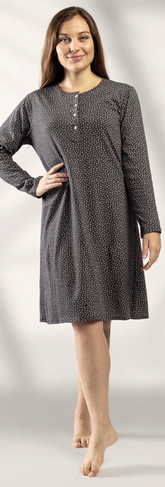 El camisón Lin 6571-C combina estilo sencillo y práctico con un delicado estampado en tonos oscuros sobre base gris. Confeccionado en 50% algodón y 50% poliéster, aporta suavidad, transpirabilidad y comodidad, ideal para un descanso confortable en cualquier temporada.