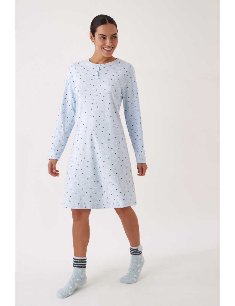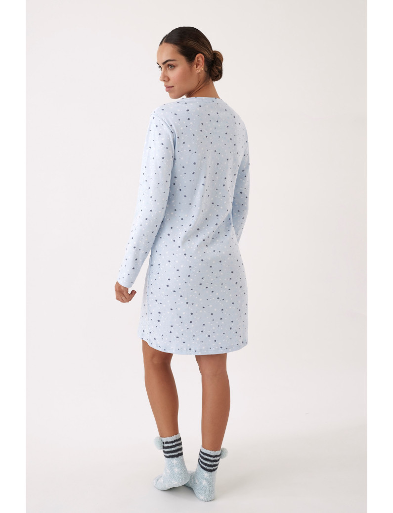 Camisón manga larga estampado estrellas sobre fondo azul claro. Confeccionado con tejido 100% algodón con acabado interior suave