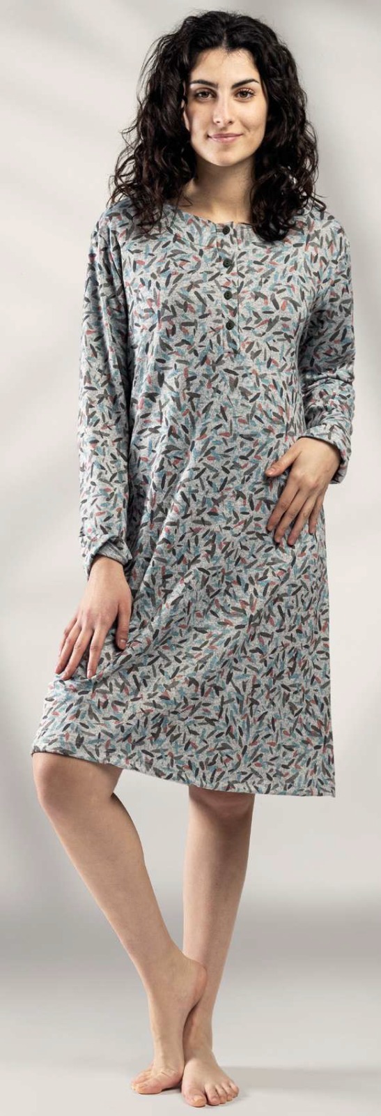 Su diseño clásico de manga larga y cuello redondo con tapeta abotonada se combina con un estampado floral multicolor sobre fondo gris, que aporta un aire femenino y delicado. La largura a la rodilla lo convierte en una prenda práctica y cómoda para el descanso.