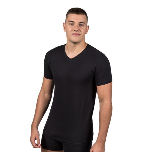Camiseta interior cuello pico manga corta, confeccionada en tejido bielástico, tiene una perfecta adherencia al cuerpo, muy confortable y duradera. El cuello es plano con lo que no se marca y es un prenda que se puede utilizar durante todo el año.