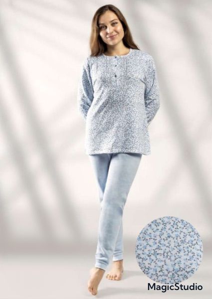 El Pijama Mujer Flor Clásica de Lin es ideal para quienes buscan comodidad con un diseño delicado y femenino. La camiseta de manga larga cuenta con cuello redondo, tapeta de botones y un encantador estampado floral en tonos azules, que aporta frescura y estilo. El pantalón, en azul claro, completa el conjunto con un corte recto y pretina elástica para un ajuste perfecto.