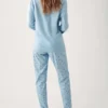 Pijama de mujer confeccionado en algodón con un simpático estampado de focas, ideal para los meses de invierno. El conjunto de dos piezas incluye camiseta de manga larga y pantalón largo con puños en el bajo, que aportan un ajuste cómodo y moderno. El tejido de algodón proporciona suavidad, transpirabilidad y calidez para un descanso confortable. El color azul suave y el diseño divertido lo convierten en una opción acogedora y con estilo para el hogar. Perfecto para relajarte o dormir cómoda y abrigada durante el invierno.