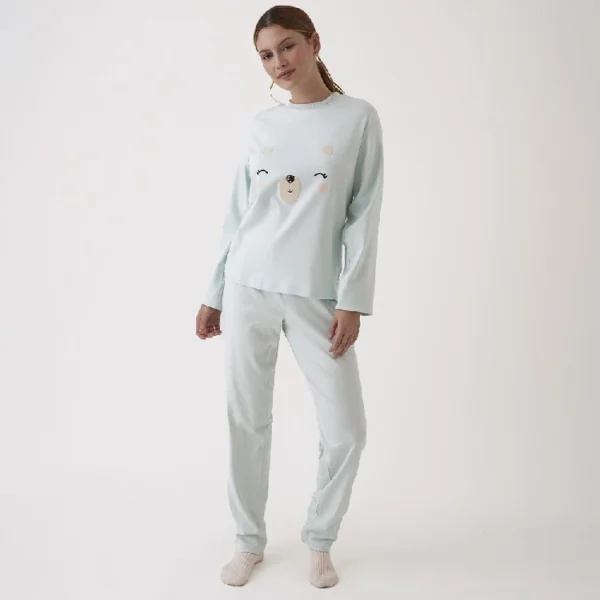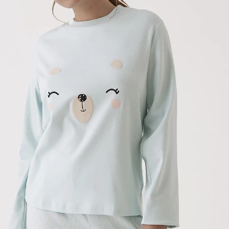 Pijama de mujer ideal para el invierno, confeccionado en algodón suave y transpirable que garantiza el máximo confort durante la noche. El conjunto incluye camiseta de manga larga con un divertido diseño de osito y pantalón largo a rayas, aportando un estilo juvenil y acogedor.